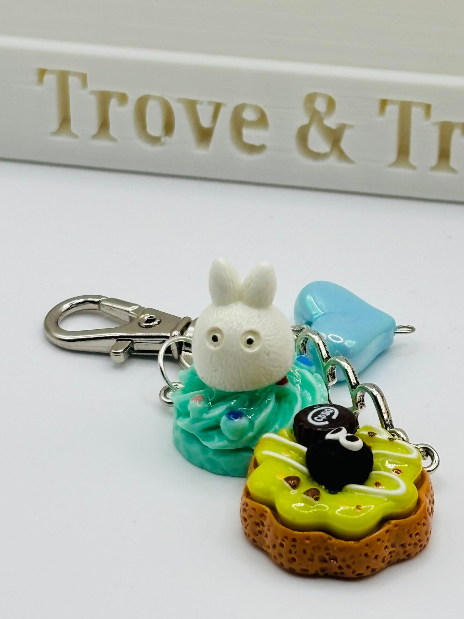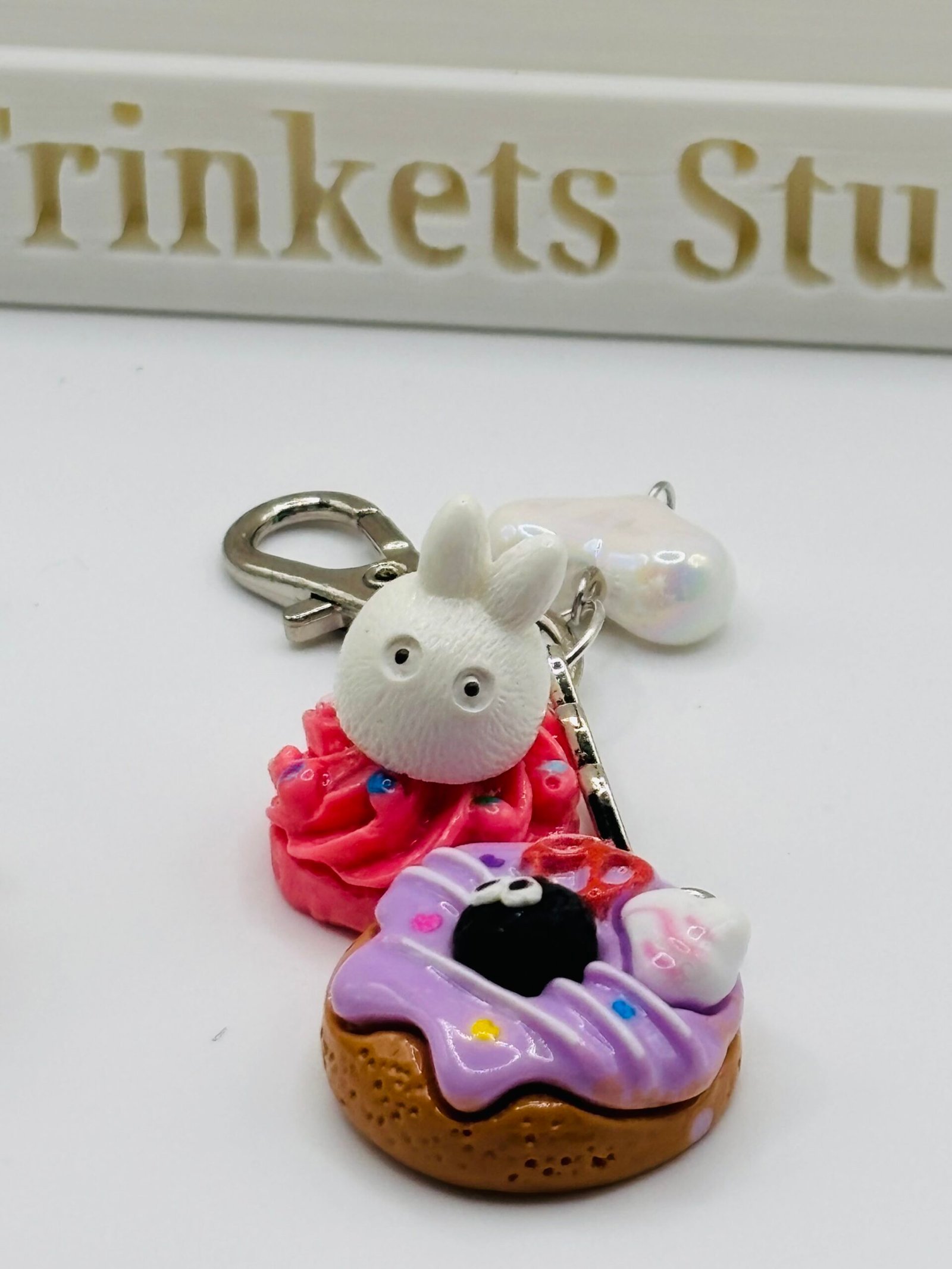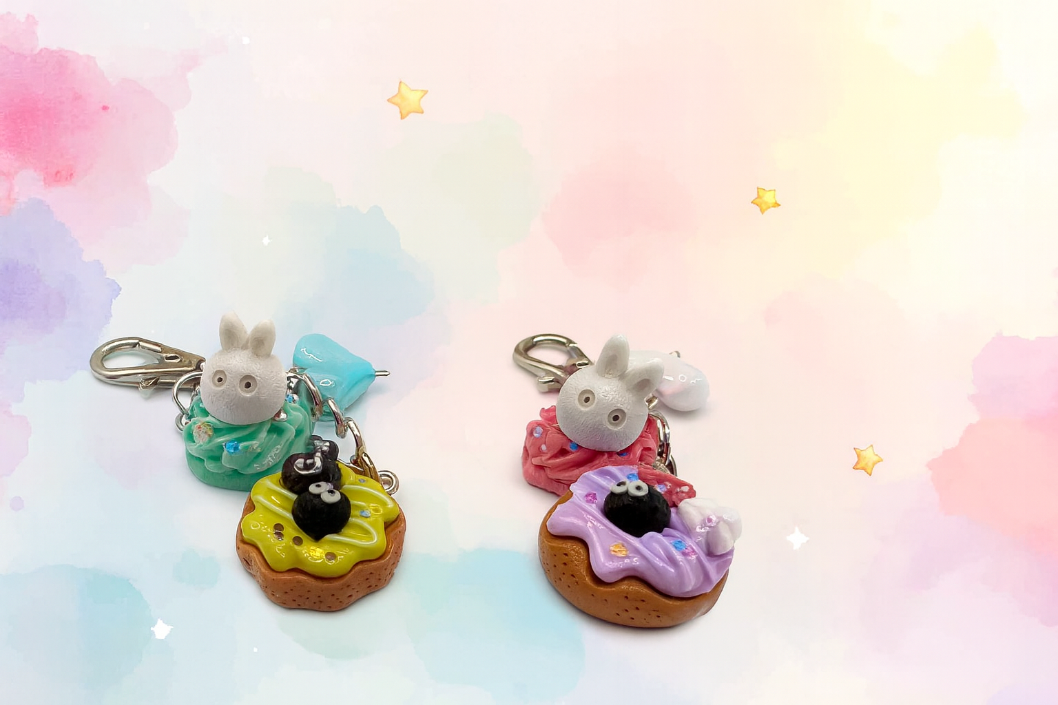 A sweet moment of mischief and delight! This charming scene features a cuddly white Tororo and a playful soot sprite sharing a cozy snack break. Nestled together among pastel pastries, they nibble on frosted donuts and colorful macaroons—each treat almost as big as they are! Whether you’re treating yourself or sending a gift, these keychains are both practical and enchanting—a keepsake to treasure!